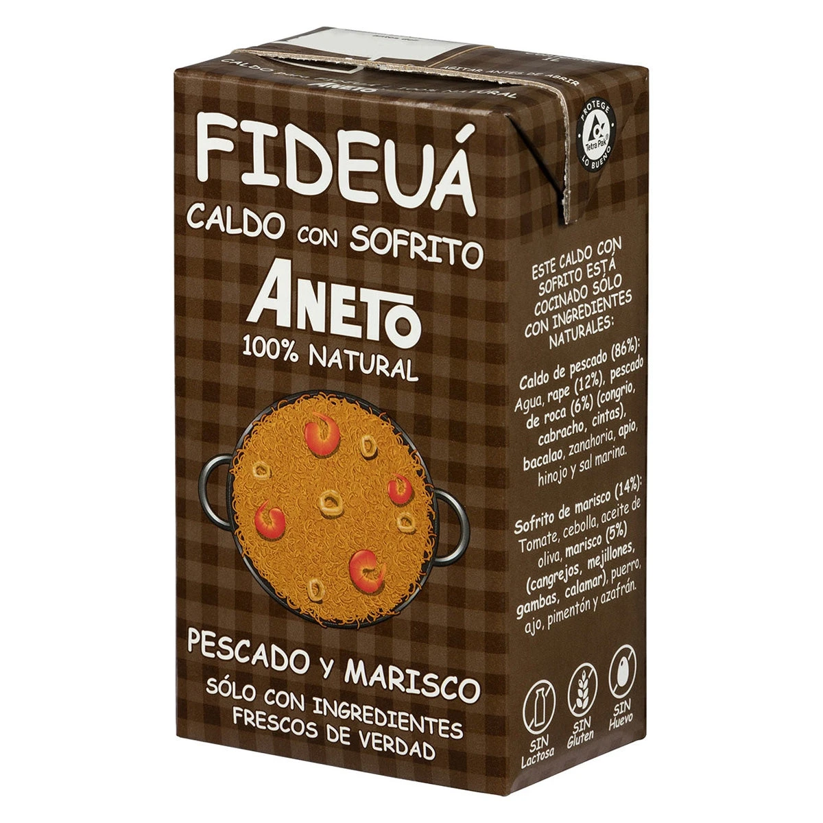 Caldo de pescado (86%): agua, rape (12%), pescado de roca (6%) (congrio, cabracho, cintas), bacalao, zanahoria, apio, hinojo y sal marina. Sofrito de marisco (14%): tomate, cebolla, aceite de oliva, marisco (5%) (cangejos, mejillones, gambas, calamar), puerro, ajo, pimentón y azafrán