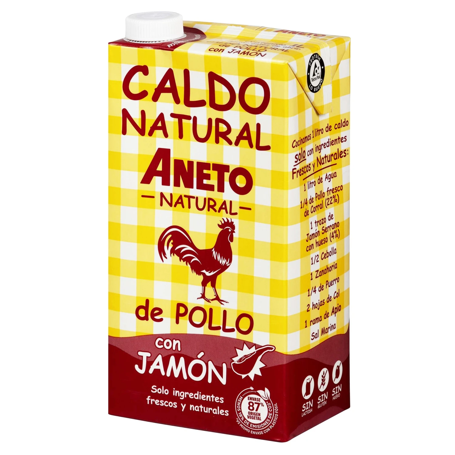 1 litro de agua, 1/4 de pollo fresco de corral (22%), 1 trozo de jamón serrano con hueso (4%), 1/2 cebolla, 1 zanahoria, 1/4 de puerro, 2 hojas de col, 1 rama de apio, sal marina