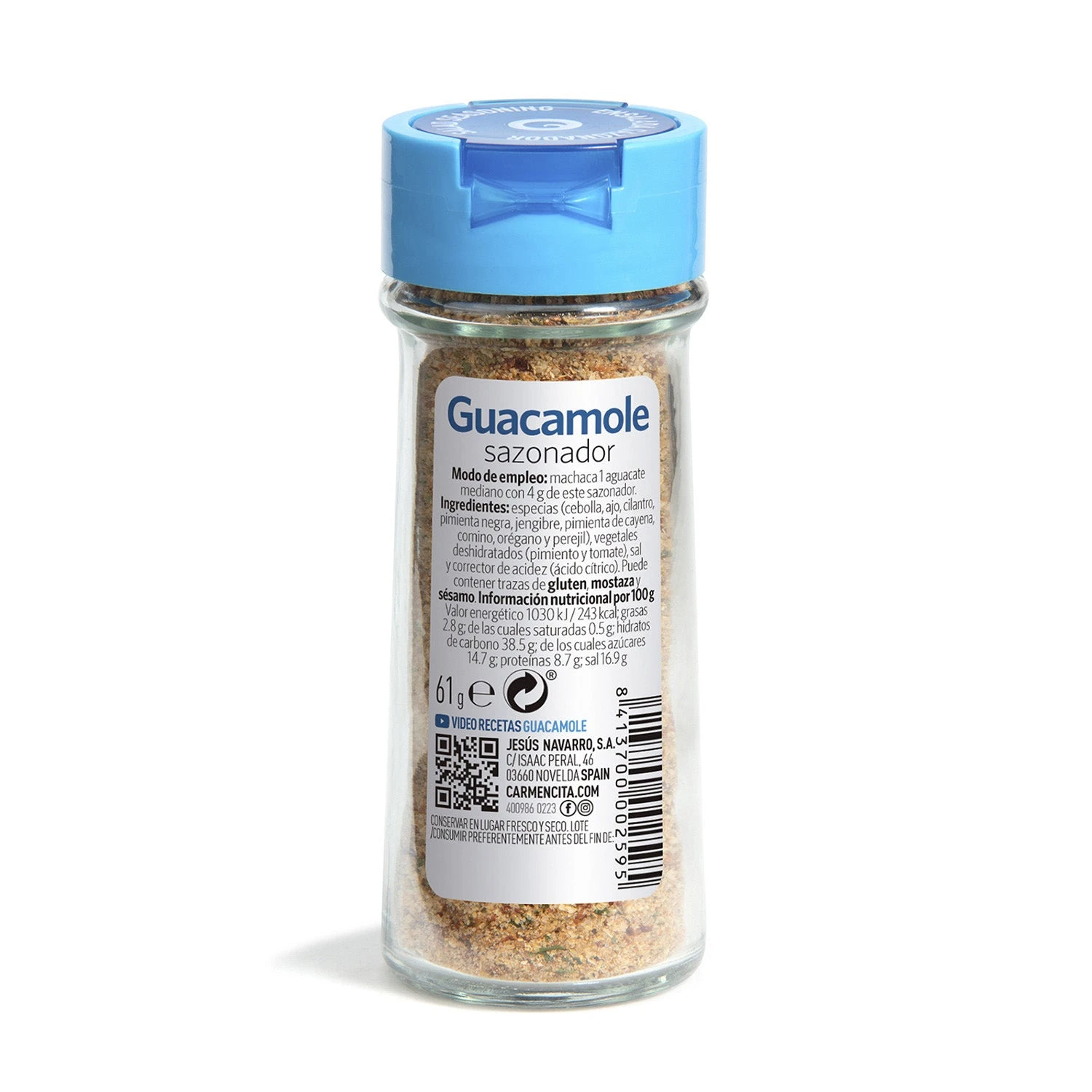 Especias (cebolla, ajo, cilantro, pimienta negra, jengibre, pimienta de cayena, comino, orégano y perejil), vegetales deshidratados (pimiento y tomate), sal y corrector de acidez (ácido cítrico).