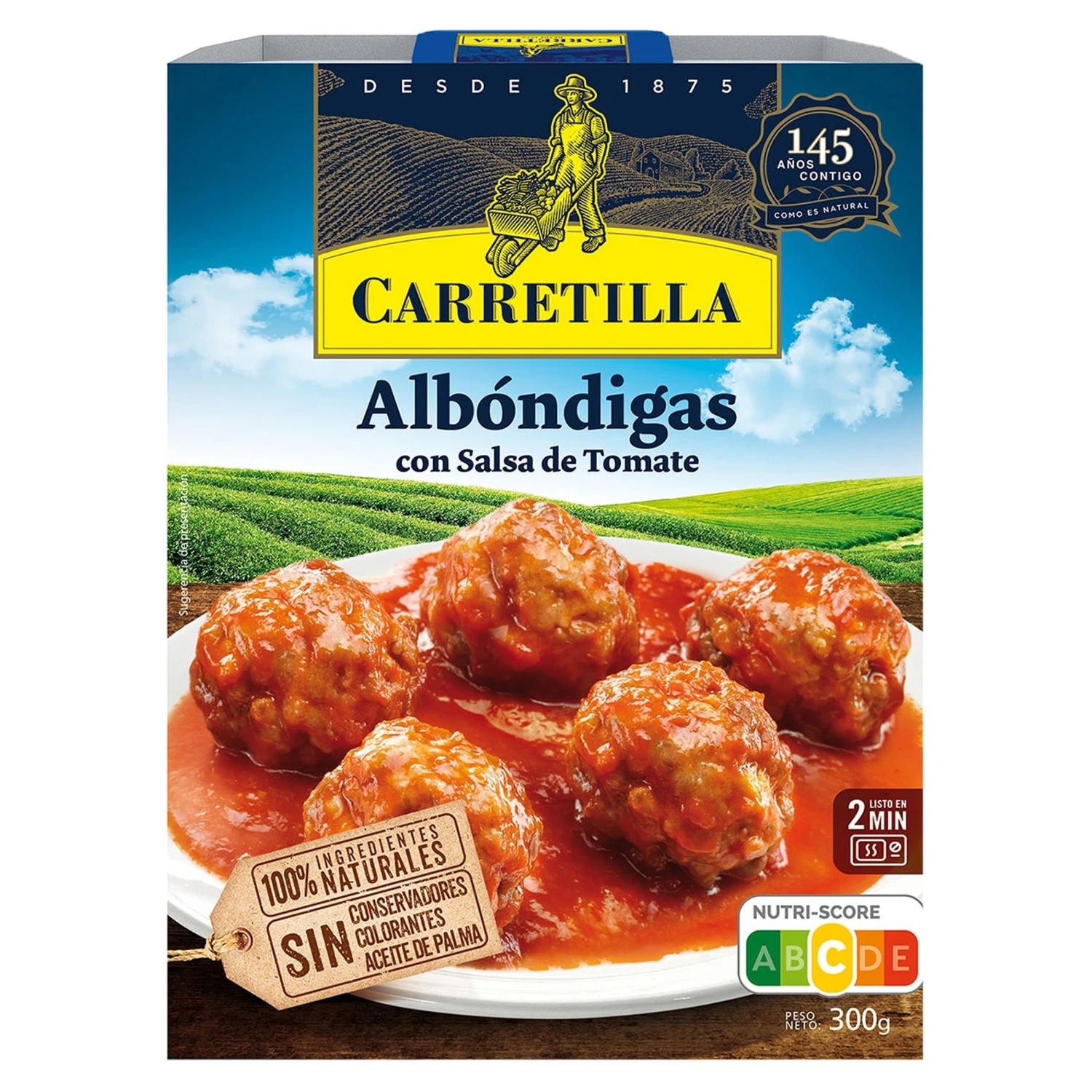 Albóndigas de carne (50%) (soja y gluten) [carne de cerdo, agua, harina de trigo, proteína de soja, aceite de girasol, , sal, especias, almidón de trigo, gluten de trigo, hidrolizado de proteínas vegetales (maíz y soja), extracto de levadura y aromas NATURALES]; Salsa de Tomate (50%) [puré de tomate, vino, azúcar, almidón de maíz, aceite de oliva, sal, cebolla, ajo y pimienta blanca]. Contiene gluten y soja. Puede contener trazas de leche y derivados (incluida lactosa) y mostaza.