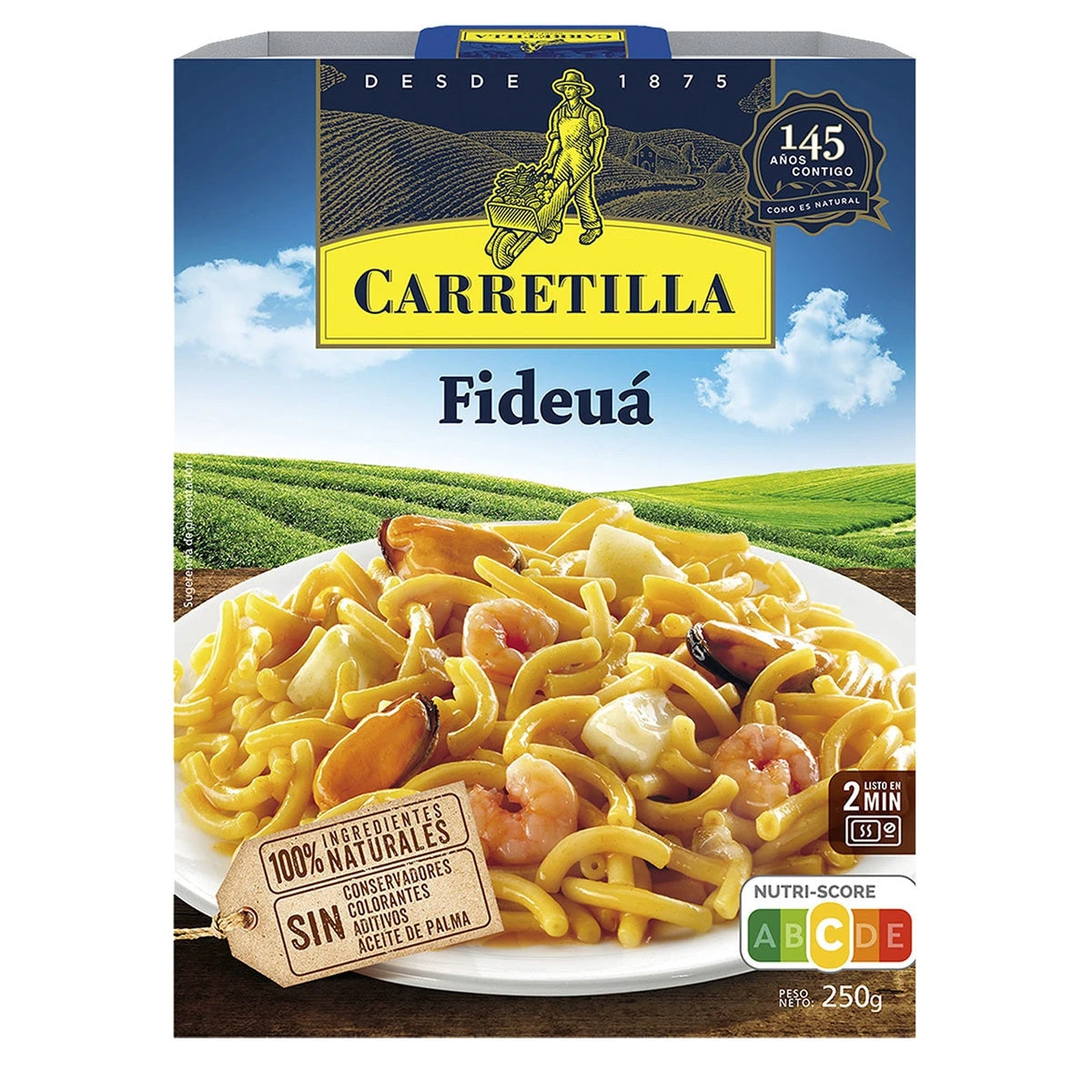 Pasta cocida (77%) (gluten y huevo),marisco (10%)[calamar (molusco), mejillón, gambas (crustáceo)(gamba y estabilizantes (E-451 y E-452)], cebolla, aceite de girasol, aroma natural (pescado), sal, pimientón dulce, extracto de azafrán y lecitina de soja. Contiene gluten, crustáceos, huevo, pescado, soja y moluscos. Puede contener trazas de leche y derivados (incluida lactosa), apio y mostaza.