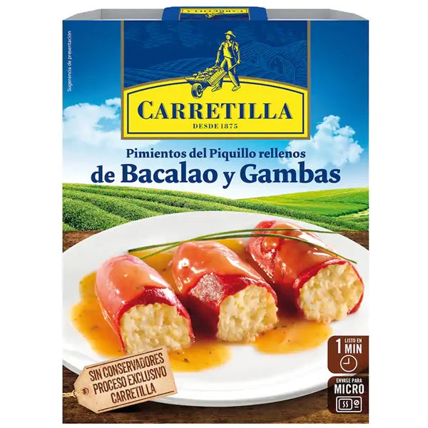 Pimientos del piquillo (31%). Relleno (29%) (pescado, lácteos y crustáceos) y salsa. INGREDIENTES DEL RELLENO: Agua, bacalao (12%), cebolla, zanahoria, merluza, almidón modificado de maíz, aceite de girasol, nata en polvo (lácteo), gambas (1.5%) [gamba y estabilizantes (E-451 y E-452)], vino blanco, ajo, sal, aroma, especias y estabilizante (carragenato).