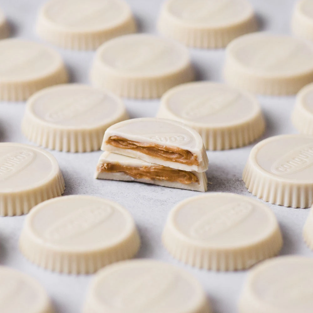 Delicioso snack de chocolate blanco, relleno de fundente y ligera CREMA DE CACAHUETE.