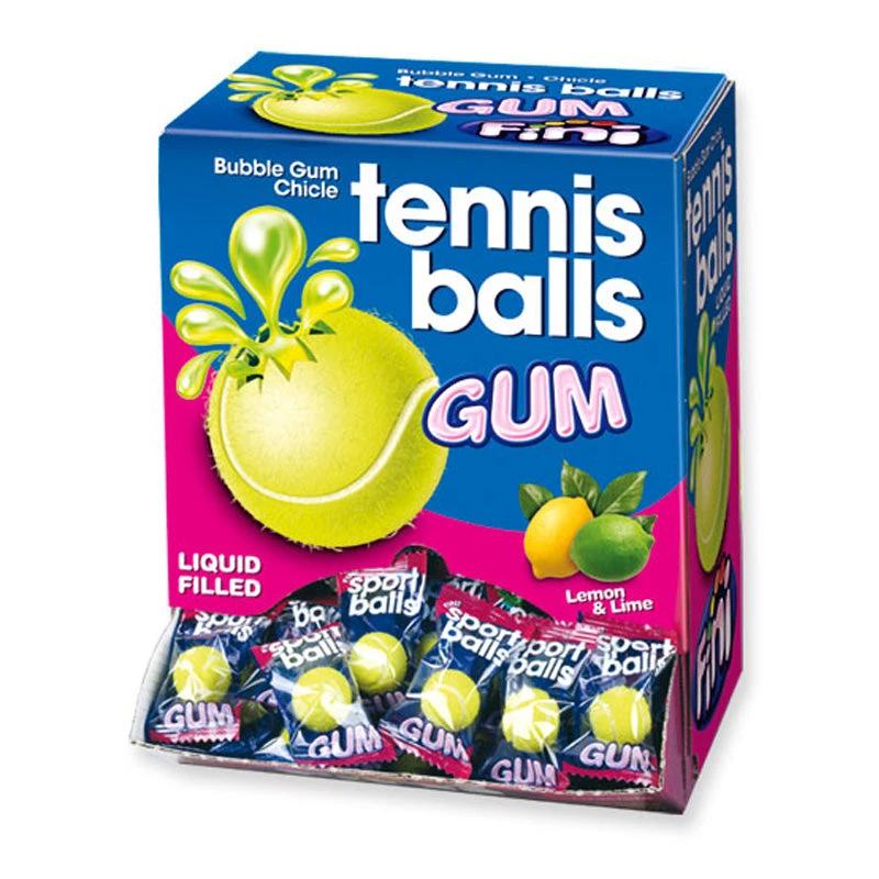 Chicles con forma de pelotas de tenis y relleno líquido con sabor a limón y envueltas individualmente.