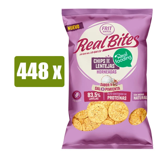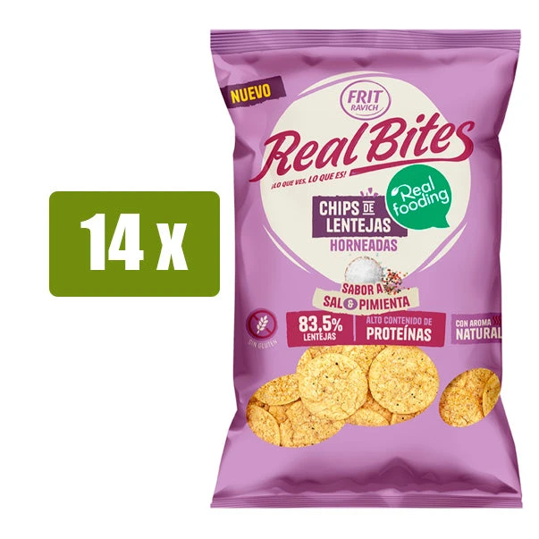 Las FRIT RAVICH Real Bites 80g son crujientes chips de lentejas horneadas, elaboradas con un 83,5% de lentejas. Con sabor a sal y pimienta.