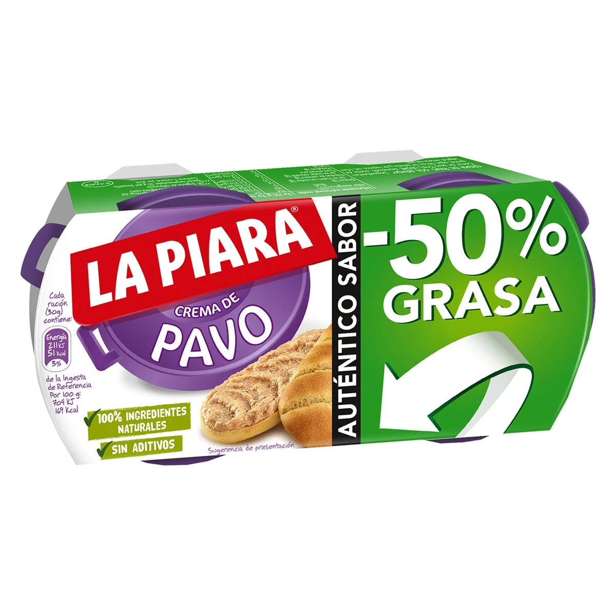 Carne de pavo (50%), LECHE desnatada, agua, aceite de girasol, fécula de patata y de tapioca, sal, fibra vegetal, aroma natural.